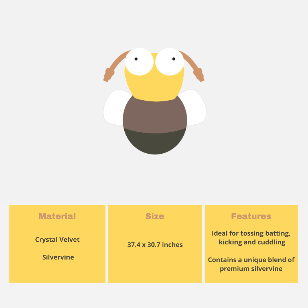 Give your furry friend a wild plaything with the Little Bee Silvervine Cat ToyCat Toy. This plush toy is filled with silvervine to entice your kitty to play. The silvervine are pure and safe for your paw-tner. This toy also features multiple textures to enhance playtime for your companion. Ideal for tossing, batting, kicking and cuddling, the Little Bee Silvervine Cat Toy will keep your cat occupied for hours to come.
